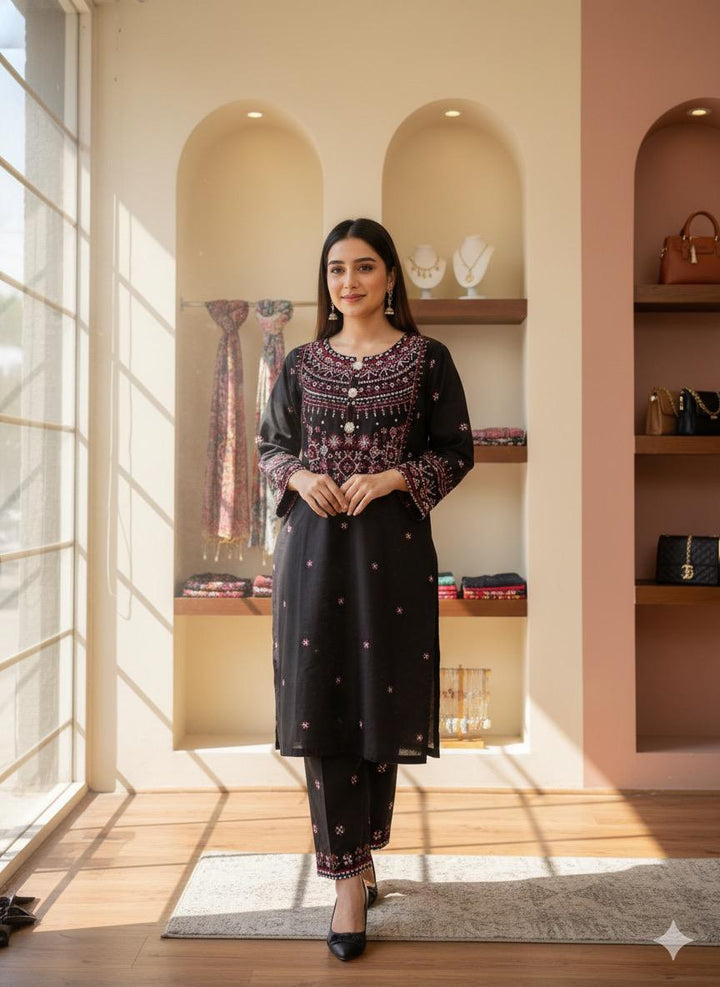 Elegant black 2-Piece Suit winter cotton Gorgeous design sleeves, slits & hemClassic V-neck design Straight trouser with gorgeous design and fine stitching Perfect for formal, party & festive wear